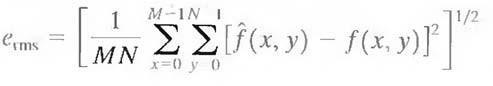 where the images are of size M X N. The root-mean-square error, erms, between f(x, y) and f^(x, y) then is the square root of the squared error averaged over the M X N array, or