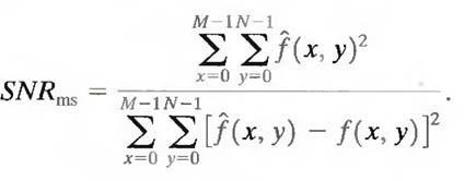 A closely related objective fidelity criterion is the mean-square signal-to-noise ratio of the compressed-decompressed image. If f^ (x, y) is considered to be the sum of the original image f(x, y) and a noise signal e(x, y), the mean-square signal-to-noise ratio of the output image, denoted SNRrms, is