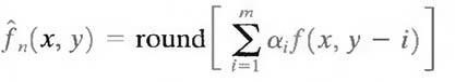 where m is the order of the linear predictor, round is a function used to denote the rounding or nearest integer operation, and the αi, for i = 1,2,..., m are prediction coefficients. In raster scan applications, the subscript n indexes the predictor outputs in accordance with their time of occurrence.