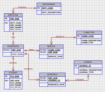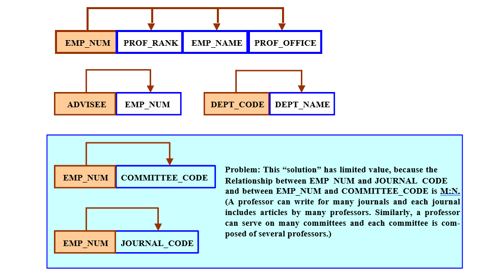 The dependency diagrams shown in Figure P6.9d1 constitute an attempt to eliminate the shortcomings of the ―system‖ shown in Figure P6.9c. Unfortunately, while this solution meets the normalization requirements, it lacks the ability to properly link the professors to committees and journals. (That’s because the relationships between professors and journals and between professors and committees are M:N.) This solution would yield tables P6.9d1 and P6.9d2. (One would expect a professor to be an employee, so it’s reasonable to assume that – at some point -- we’ll have to create a supertype/subtype relationship between employee and professor. (To save space, we show only the first three EMP_NUM value sets from Table P6.9.)
