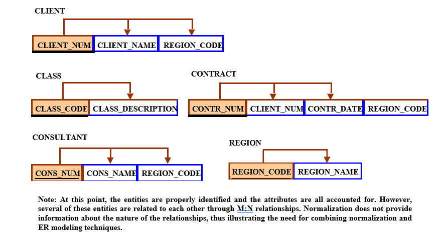 Keep in mind that the preceding dependency diagrams and relational schemas do not (yet) define a practical design. For example, processing requirements usually dictate that the attributes be made more atomic. (Printing mailing labels, creating mailing lists and phone directories would mandate the decomposition of CLIENT_NAME into CLIENT_FNAME, CLIENT_LNAME, and CLIENT_INITIAL. The CONS_NAME must be similarly decomposed.)
