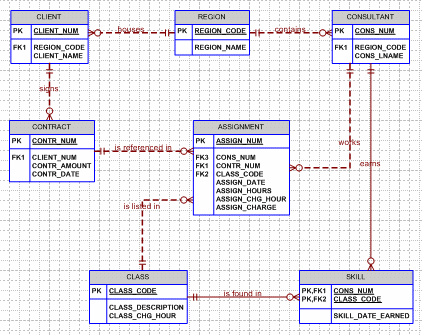 Also, remember that this simple system lacks many important entities and attributes. For instance, at this point there's no way to contact the clients, nor can clients contact the consultants. Clearly, we ought to add addresses and phone numbers. However, we have added some crucial relationships to enable us to track billing charges by class and to track billable hours by class, by consultant, and by class. (Note also that the ASSIGN_CHG_HOUR is written into the ASSIGNMENT table by the applications software from the CLASS table to ensure the historical accuracy of the charges. If the CLASS_CHG_HOUR changes, we must preserve the original charge per hour that was in effect when the assignment charge was made.) You can let your students use database software such as Microsoft Access to implement this system. Naturally, you can add tables and attributes to enable the system to handle invoicing and reporting of consulting activities by consultant, by type, by client, and so on. We have added a few of the appropriate entities and attributes in the answer to problem 10c.