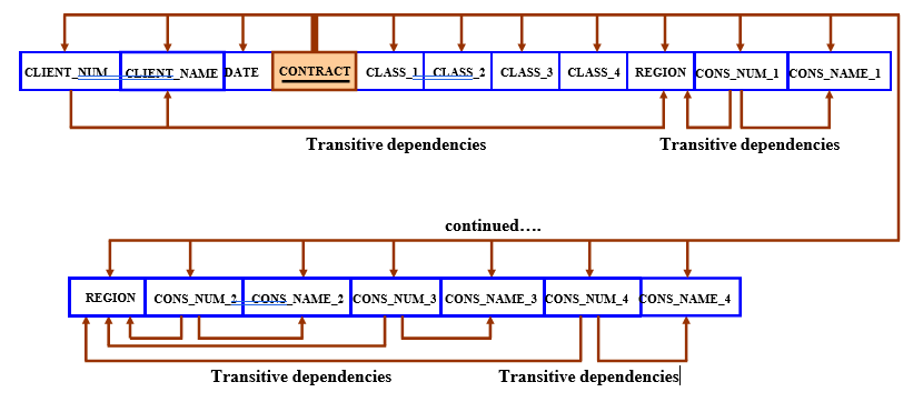 Or, if you prefer that the PK be the first listed attribute, you can write the relational schema this way: CONTRACT(CONTRACT, CLIENT_NUM, CLIENT_NAME, DATE, CLASS_1, CLASS_2,