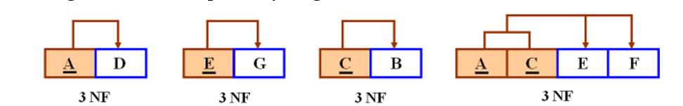 The solution is shown in Figure P6.8c. Note that the A, C, and E attributes in the first three structures can be used as foreign keys in the fourth structure.