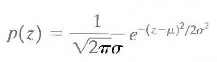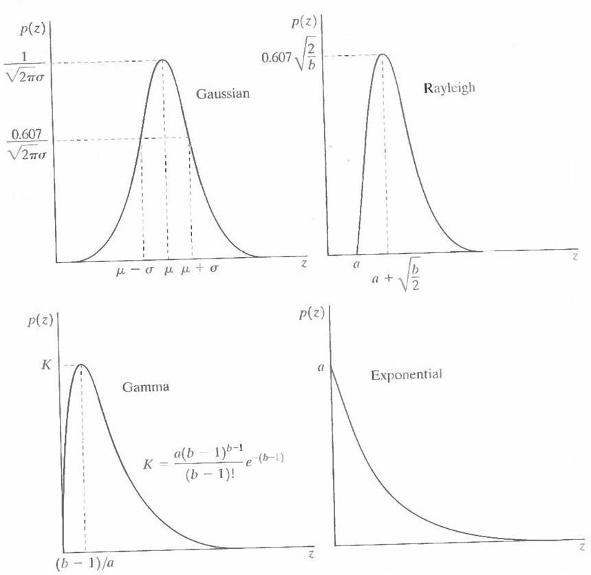 where z represents gray level, µ is the mean of average value of z, and a σ is its standard deviation. The standard deviation squared, σ2, is called the variance of z. A plot of this function is shown in Fig. 5.10. When z is described by Eq. (1), approximately 70% of its values will be in the range [(µ - σ), (µ +σ)], and about 95% will be in the range [(µ - 2σ), (µ + 2σ)].
