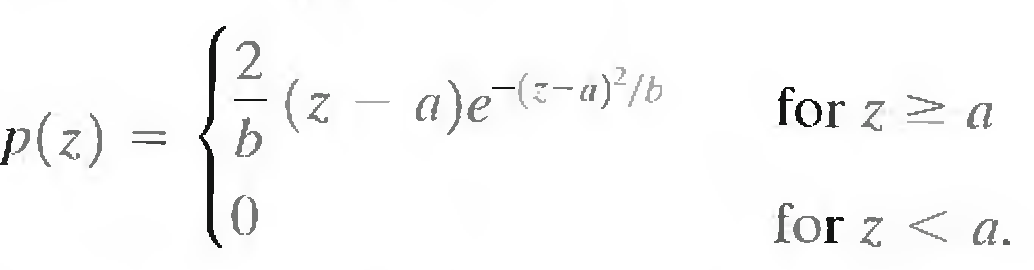 Figure 5.10 shows a plot of the Rayleigh density. Note the displacement from the origin and the fact that the basic shape of this density is skewed to the right. The Rayleigh density can be quite useful for approximating skewed histograms.