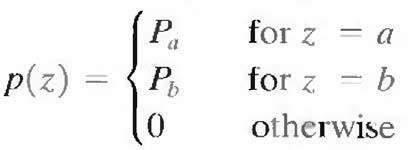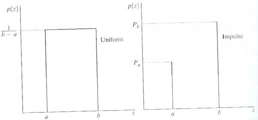 If b > a, gray-level b will appear as a light dot in the image. Conversely, level a will appear like a dark dot. If either Pa or Pb is zero, the impulse noise is called unipolar. If neither probability is zero, and especially if they are approximately equal, impulse noise values will resemble salt-and-pepper granules randomly distributed over the image. For this reason, bipolar impulse noise also is called salt-and-pepper noise. Shot and spike noise also are terms used to refer to this type of noise.