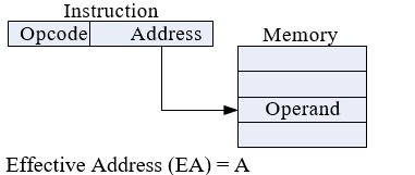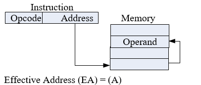 - In this mode the effective address is equal to the address part of the instruction. The operand resides in memory and its address is given directly by the address field of the instruction.