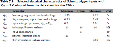 Before leaving this topic, let us look more closely at the way in which thresholds and other parameters are specified in the data sheet. Table 7.1 shows a small extract for the F20xx. There is a minimum and maximum for each of the two threshold voltages. When is each important? Suppose that the input is initially at VSS: