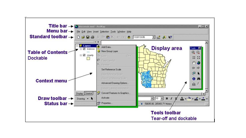 ArcMap does Primary display applications and •Perform map-based tasks like: Displaying, – Editing, Querying, Analyzing, Charting and –reporting. ArcMap interface is as seen below
