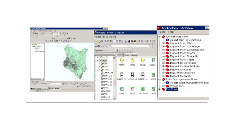 - ArcToolbox, for specialized data conversions and analyses, available as a window in both