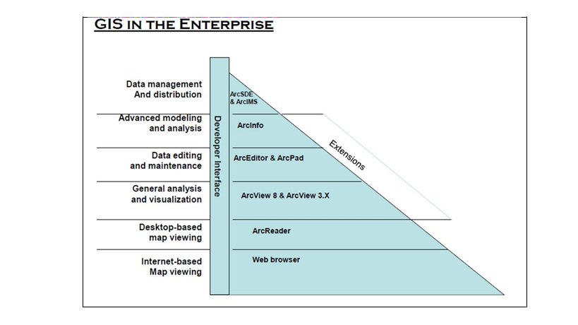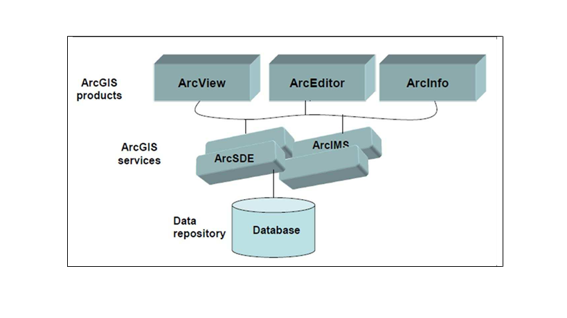 ArcGIS is commercial GIS software by ESRI Inc, USA. It comprised: 3 products, 3 application modules, ArcGIS Services, Database, extensions and ArcObjects