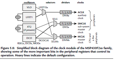 Internal very low-power, low-frequency oscillator, VLO: Available in only the more recent MSP430F2xx devices. It provides an alternative to LFXT1 when the accuracy of a crystal is not needed. Digitally controlled oscillator, DCO: Available in all devices and one of the highlights of the MSP430. It is basically a highly controllable RC oscillator that starts in less than 1 _s in newer devices. It is not quite true that any of the clocks can come from any of the sources, but the selection can seem bewildering. Fortunately the default configuration described in the section