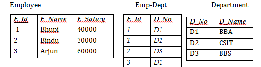 In the above relation {Emp-Id, Dept-No} is the primary key. Emp-Name, Emp- Salary and Dept-Name all depend upon {Emp-Id, Dept-No}. Again Emp- IdàEmp-Name, Emp-IdàEmp-Salary and Dept-NoàDept-Name, thus there also occur partial dependency. Due to which this relation is not in 2 NF.