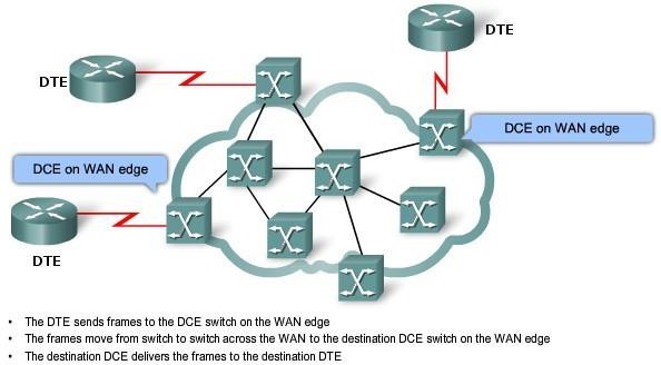 When carriers use Frame Relay to interconnect LANs, a router on each LAN is the DTE. A serial connection, such as a T1/E1 leased line, connects the router to the Frame Relay switch of the carrier at the nearest point-of-presence (POP) for the carrier. The Frame Relay switch is a DCE device. Network switches move frames from one DTE across the network and deliver frames to other DTEs by way of DCEs.