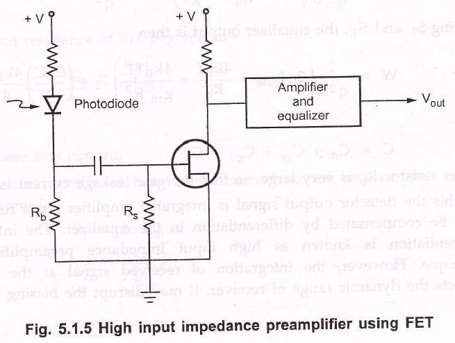 - If bias resistor Rb is very large, so that the gate leakage current is very low. For this the detector output signal is integrated amplifier input It is to be compensated by differentiation in the equalizer. The integration – differentiation is known as high input impedance epreamplifier design technique. However, the integration of receive signal at the front end restricts the dynamic range of receiver. It may disrupt the biasing levels and receiver may fail. To correct it the line coded data or AGC may be employed such receivers can have dynamic ranges in excess of 20 dB.