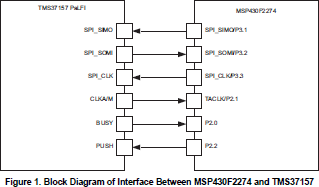 Figure 1 shows the interface between MSP430F2274 and TMS37157. The TMS37157 is connected to the MSP430F2274 through a 3-wire SPI interface. To simplify communication between the MSP430F2274 and TMS37157, the BUSY pin of the TMS37157 is connected to the MSP430. The BUSY pin indicates the readiness of the TMS37157 to receive the next data byte from the MSP430F2274. The PUSH pin is used to wake up the PaLFI from standby mode so that the MSP430F2274 can access the EEPROM of the PaLFI. CLKAM is used for the antenna automatic tune feature of the PaLFI target board.