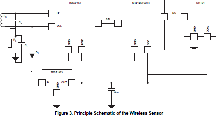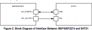 Figure 2 shows the interface between MSP430F2274 and SHT21. I2C is used to connect both devices. The MSP430F2274 contains two communication modules. One is used as a UART connection to a host PC, the other one is used to communicate to the TMS37157. Therefore, the I2C interface has been implemented completely in the software.