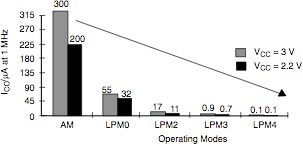 Low Power Modes (LPMs) represents the ability to scale the microcontroller’s power usage by shutting off parts of the MSP430. The CPU and several other modules such as clocks are not always needed. Many applications which wait until a sensor detects a certain event can benefit from turning off unused (but still running) parts of the microcontroller to save energy, turning them back on quickly when needed.