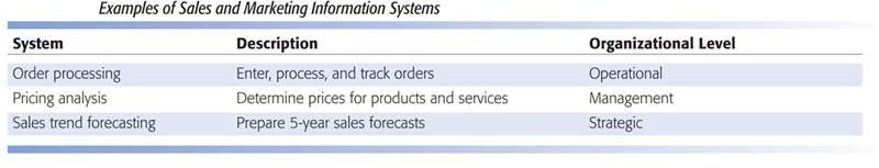 These information systems are arranged by organizational level. At strategic level, these systems monitor trends affecting new products and sales opportunities, support planning for new products and services, and monitor the performance of competitors. At the management level, these systems support market research, advertising and promotional campaigns, and pricing decisions; they also analyze sales performance and the performance of the sales staff. At the knowledge level, these systems support market analysis activities. At the operational level, these systems assist in locating and contacting prospective customers, tracking sales, processing orders, and providing customer service support.