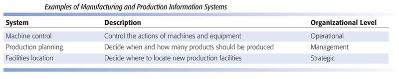 These information systems are also arranged by organizational level. At the strategic level, these systems deal with the firm‘s long term manufacturing goals, such as where to locate new plants or whether to invest in new manufacturing technology. At the management level, these systems analyze and monitor manufacturing and production costs and resources. At knowledge level, these systems deal with creating and distributing design knowledge or expertise to drive the production process. At the operational level, these systems deal with the status of production tasks.