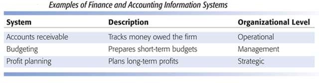 These information systems are also arranged by organizational level. At the strategic level, these systems establish long-term investment goals for the firm and provide long-range forecasts of the firm‘s financial performance. At the management level, these systems help managers oversee and control the firm‘s financial resources. At the knowledge level, these systems support finance and accounting by providing analytical tools and workstations for designing the right mix of investments to maximize returns for the firm. At the operational level, these systems track the flow of funds in the firm through transactions.