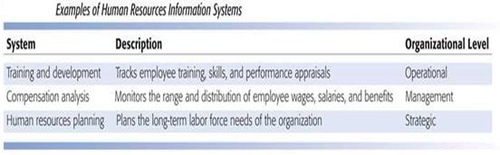 These information systems are also arranged by organizational level. At the strategic level, these systems identify the manpower requirements (skills, educational level, types of position, number of positions, and cost) for meeting the firm‘s long-term business plans. At the management level, these systems help managers monitor and analyze the recruitment, allocation, and compensation of employees. At the knowledge level, these systems support analysis activities related to job design, training, and the modeling of employee career paths and reporting relationships. At the operational level, these systems track the recruitment and placement of the firm‘s employees.
