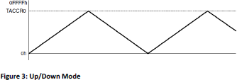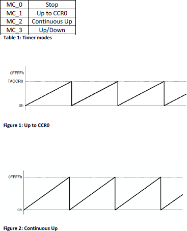 Pulse-width modulation is done on the MSP430 through the timer. A timer on the MSP430 increases a register by one every clock cycle on the MSP430. There are four options for the MSP430 timer, pictured in Table 1 below. MC_0 disables the timer. MC_1 counts from 0x0000 to the value stored in the CCR0 register resets to 0x0000 and repeats. MC_2 counts from 0x0000 to 0xFFFF, resets to 0x0000, and repeats. MC_3 counts from 0x0000 to the value stored in the CCR0 register counts down from this value to 0x0000 and repeats. Graphical representations of MC_1 through MC_3 are attached in Figure 1 through Figure 3, which are taken from TI’s MSP430x2xx User’s Guide.