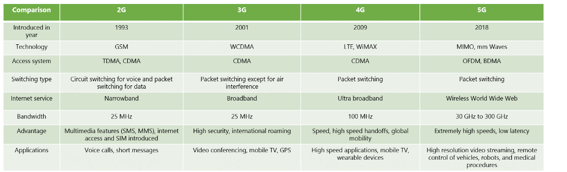 Comparatively explain 2G,3G,4G and 5G technology to provide wireless services