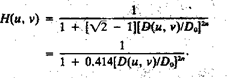 The transfer function of the Butterworth lowpass (BLPF) of order n and with cutoff frequency locus at a distance Do, from the origin is defined by the relation