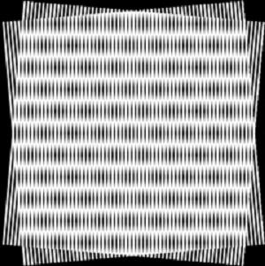 There is one special case of significant importance in which a function of infinite duration can be sampled over a finite interval without violating the sampling theorem. When a function is periodic, it may be sampled at a rate equal to or exceeding twice its highest frequency and it is possible to recover the function from its samples provided that the sampling captures exactly an integer number of periods of the function. This special case allows us to illustrate vividly the Moiré effect. Figure 8 shows two identical periodic patterns of equally spaced vertical bars, rotated in opposite directions and then superimposed on each other by multiplying the two images. A Moiré pattern, caused by a breakup of the periodicity, is seen in Fig.8 as a 2-D sinusoidal (aliased) waveform (which looks like a corrugated tin roof) running in a vertical direction. A similar pattern can appear when images are digitized (e.g., scanned) from a printed page, which consists of periodic ink dots.