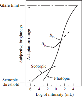 Figure plot of light intensity versus subjective brightness, illustrates this characteristic. The long solid curve represents the range of intensities to which the visual system can adapt. In photopic vision alone, the range is about 106. The transition from scotopic to photopic vision is gradual over the approximate range from 0.001 to 0.1 millilambert (–3 to –1 mL in the log scale), as the double branches of the adaptation curve in this range show.