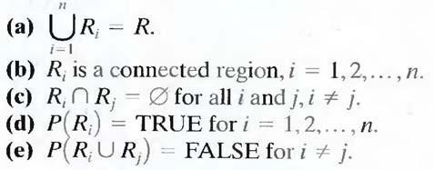 Here, P (Ri) is a logical predicate defined over the points in set Ri and Ǿ` is the null set. Condition (a) indicates that the segmentation must be complete; that is, every pixel must be in a region. Condition (b) requires that points in a region must be connected in some predefined sense. Condition (c) indicates that the regions must be disjoint. Condition (d) deals with the properties that must be satisfied by the pixels in a segmented region—for example P (Ri) = TRUE if all pixels in Ri, have the same gray level. Finally, condition (c) indicates that regions Ri and Rj are different in the sense of predicate P.