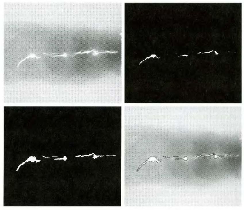 If a pixel was found to be connected to more than one region, the regions were merged. Figure 7.1 (c) shows the regions that resulted by starting with the seeds in Fig. 7.2 (b) and utilizing the criteria defined in the previous paragraph. Superimposing the boundaries of these regions on the original image [Fig. 7.1(d)] reveals that the region-growing procedure did indeed segment the defective welds with an acceptable degree of accuracy. It is of interest to note that it was not necessary to specify any stopping rules in this case because the criteria for region growing were sufficient to isolate the features of interest.