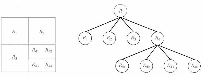 Let R represent the entire image region and select a predicate P. One approach for segmenting R is to subdivide it successively into smaller and smaller quadrant regions so that, for any region Ri, P(Ri) = TRUE. We start with the entire region. If P(R) = FALSE, we divide the image into quadrants. If P is FALSE for any quadrant, we subdivide that quadrant into subquadrants, and so on. This particular splitting technique has a convenient representation in the form of a so-called quadtree (that is, a tree in which nodes have exactly four descendants), as illustrated in Fig. 7.3. Note that the root of the tree corresponds to the entire image and that each node corresponds to a subdivision. In this case, only R4 was subdivided further.
