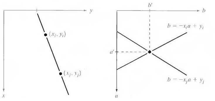 Hough [1962] proposed an alternative approach, commonly referred to as the Hough transform. Consider a point (xi, yi) and the general equation of a straight line in slope-intercept form, yi = a.xi + b. Infinitely many lines pass through (xi, yi) but they all satisfy the equation yi = a.xi + b for varying values of a and b. However, writing this equation as b = -a.xi + yi, and considering the ab-plane (also called parameter space) yields the equation of a single line for a fixed pair (xi, yi). Furthermore, a second point (xj, yj) also has a line in parameter space associated with it, and this line intersects the line associated with (xi, yi) at (a', b'), where a' is the slope and b' the intercept of the line containing both (xi, yi) and (xj, yj) in the xy-plane. In fact, all points contained on this line have lines in parameter space that intersect at (a', b'). Figure 3.1 illustrates these concepts.