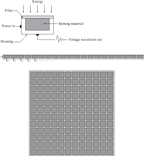 Figure 5.1 (a) shows the components of a single sensor. Perhaps the most familiar sensor of this type is the photodiode, which is constructed of silicon materials and whose output voltage waveform is proportional to light. The use of a filter in front of a sensor improves selectivity. For example, a green (pass) filter in front of a light sensor favors light in the green band of the color