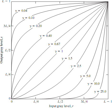 to account for an offset (that is, a measurable output when the input is zero).However, offsets typically are an issue of display calibration and as a result they are normally ignored in Eq. Plots of s versus r for various values of g are shown in Fig. 1.2. As in the case of the log transformation, power-law curves with fractional values of g map a narrow range of dark input values into a wider range of output values,with the opposite being true for high-er values of input levels. Unlike the log function, however, we notice here a family of possible transformation curves obtained simply by varying γ. As expected, we see in Fig.1.2 that curves generated with values of g>1 have exactly the opposite effect as those generated with values of g<1. Finally, we note that Eq. reduces to the identity transformation when c = γ = 1. A variety of devices used for image capture, printing, and display respond according to a power law.By convention, the exponent in the power-law equation is referred to as gamma. The proces used to correct this power-law response phenomena is called gamma correction. For example, cathode ray tube (CRT) devices have an intensity-to-voltage response that is a power function, with exponents varying from approximately 1.8 to 2.5.With reference to the curve for g=2.5 in Fig.1.2, we see that such display systems would tend to produce images that are darker than intended.