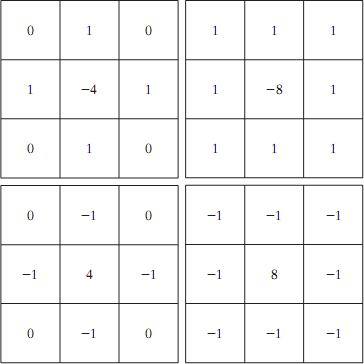 Fig.11.1. (a) Filter mask used to implement the digital Laplacian (b) Mask used to implement an extension of this equation that includes the diagonal neighbors. (c) and (d) Two other implementations of the Laplacian.