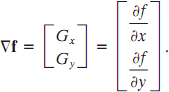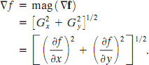 The components of the gradient vector itself are linear operators, but the magnitude of this vector obviously is not because of the squaring and square root operations. On the other hand, the partial derivatives are not rotation invariant (isotropic), but the magnitude of the gradient vector is. Although it is not strictly correct, the magnitude of the gradient vector often is referred to as the gradient.