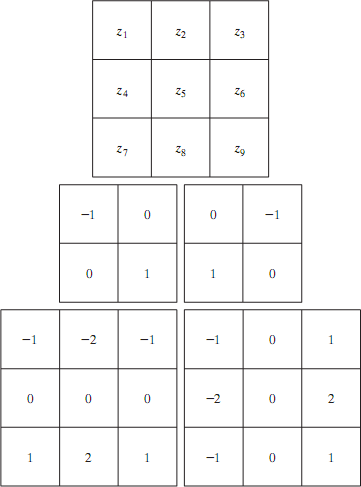 This equation can be implemented with the two masks shown in Figs. 11.2 (b) and(c). These masks are referred to as the Roberts cross-gradient operators. Masks of even size are awkward to implement. The smallest filter mask in which we are interested is of size 3 x 3.An approximation using absolute values, still at point z5 , but using a 3*3 mask, is