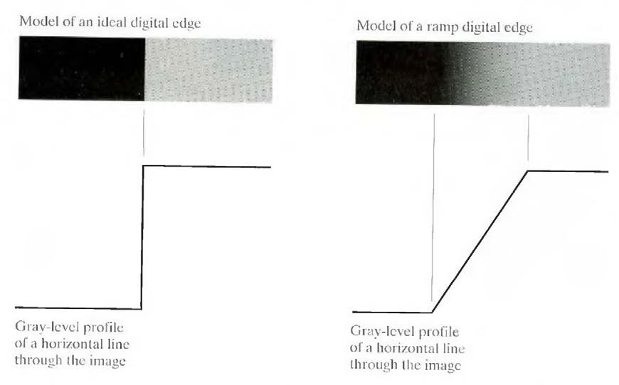 In practice, optics, sampling, and other image acquisition imperfections yield edges that are blurred, with the degree of blurring being determined by factors such as the quality of the image acquisition system, the sampling rate, and illumination conditions under which the image is acquired. As a result, edges are more closely modeled as having a "ramp like" profile, such as the one shown in Fig.2.1 (b).