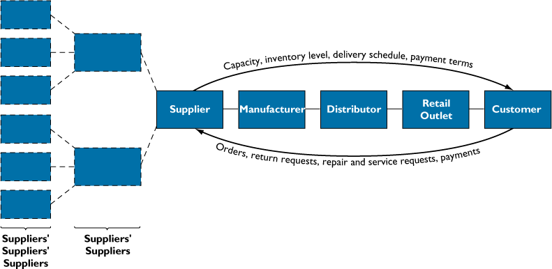 customers. It links suppliers, manufacturing plants, distribution centers, conveyances, retail outlets, people and information through processes such as procurement, inventory control, distribution, and delivery to supply goods and services from source through consumption. Supply chain also includes reverse logistics in which returned items flow in the reverse direction from buyer back to the seller.